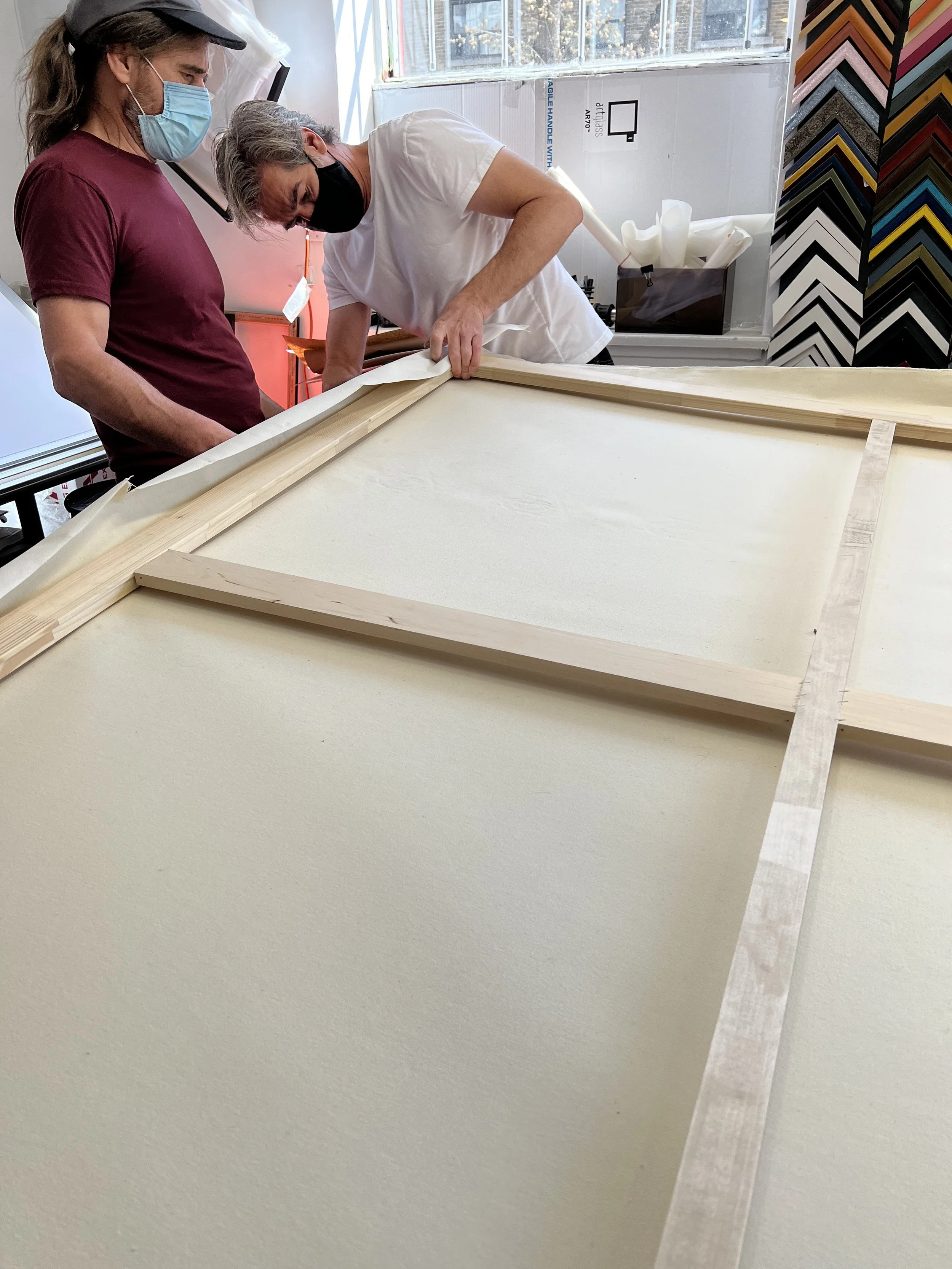 We stretch a lot of canvases, both painted and unpainted. Depending upon the size of the canvas, we have 5 different sizes of wood stretcher bars we use (light-weight, medium-weight, heavy-weight as well as 1 1/2" or 2" deep "Gallery Wrap" styles). We also believe in using cross bars to prevent canvases being stretched from developing an hourglass shape.